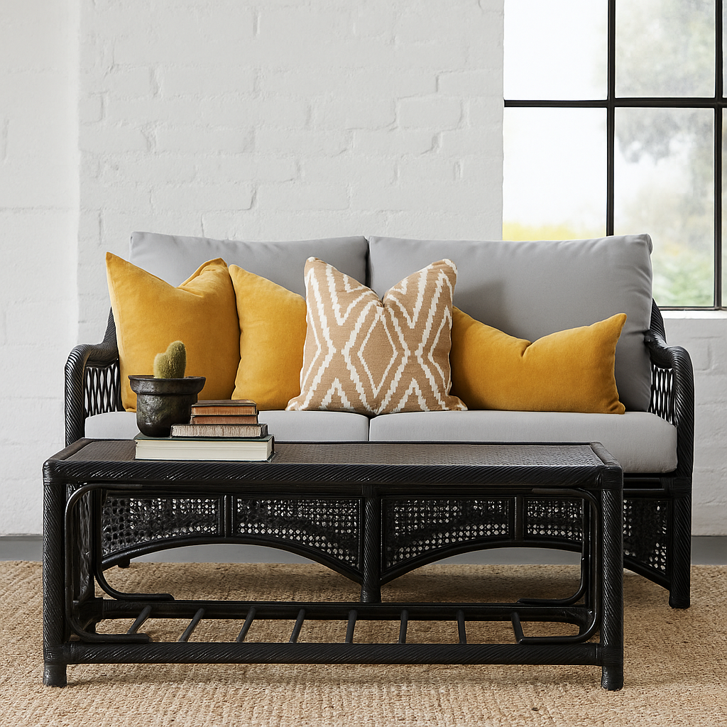 Elevate your indoor or outdoor space with the IRA 2-Seater Sofa & Coffee Table Set, featuring a modern satin black finish, handwoven rattan, and a sturdy wooden frame. Perfect for living rooms, gardens, patios, or balconies, this versatile set combines comfort, durability, and style. The set includes a 2-seater sofa with seating cushions (color may vary) and a matching coffee table. Throw cushions are not included, but customization options are available upon request.