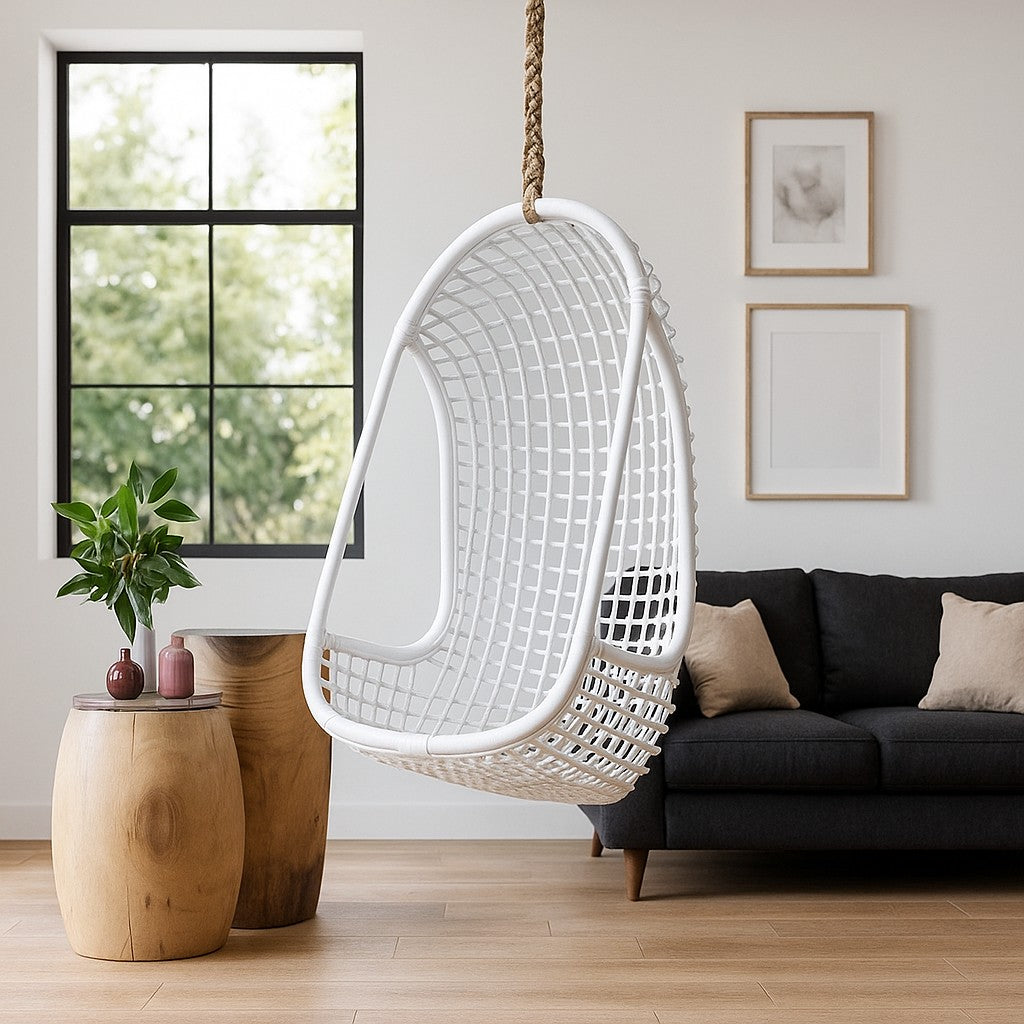 Enjoy relaxed, cozy seating with the IRA Rattan Hanging Chair in a fresh white finish. Handcrafted from natural cane/rattan, this elegant swing adds airy texture and modern charm to balconies, patios, and indoor corners. Its compact footprint and supportive form make it perfect for reading, lounging, or unwinding after a long day.